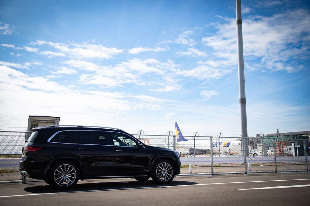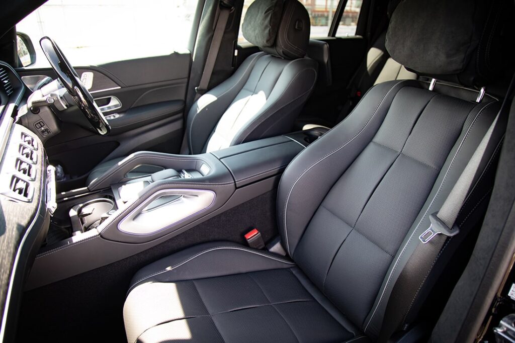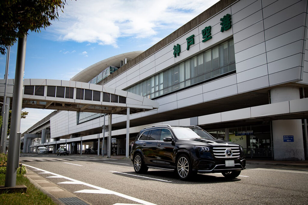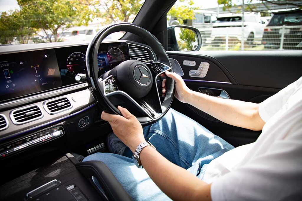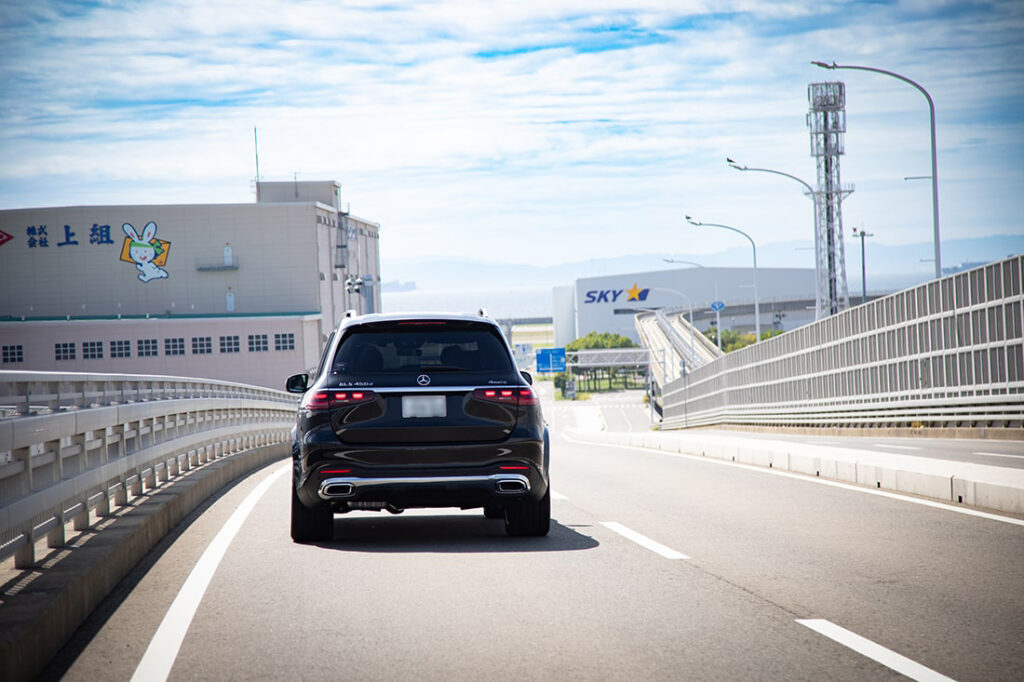 まず目を惹くのは伸びやかな体躯に、揺るぎない自信を感じさせる力強いフロントエンド、シャープなサイドパネル、優美なリアエンド。全長5mを超える堂々としたボディは、空港へと向かう神戸の都市部でもひときわ目を引く存在だ。さらにはスポーティ感を際立たせるクロームアクセント、車体の大きさにマッチした大型 22インチのAMGホイール(オプション設定)が足元を引き締め、一層ラグジュアリーな雰囲気を醸している。