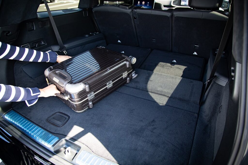 ラゲッジスペースは3列目シート使用時でも355ℓの容量を確保。分割可倒式の2列目、3列目シートを格納時はさらに、2,400ℓにまで拡大するから、ご覧の通り、スーツケースも小さく見えてしまうほど、容量的にもプレミアムな性能を誇る。乗車人数やシーンに合わせて、フレキシブルに活用できるはずだ。