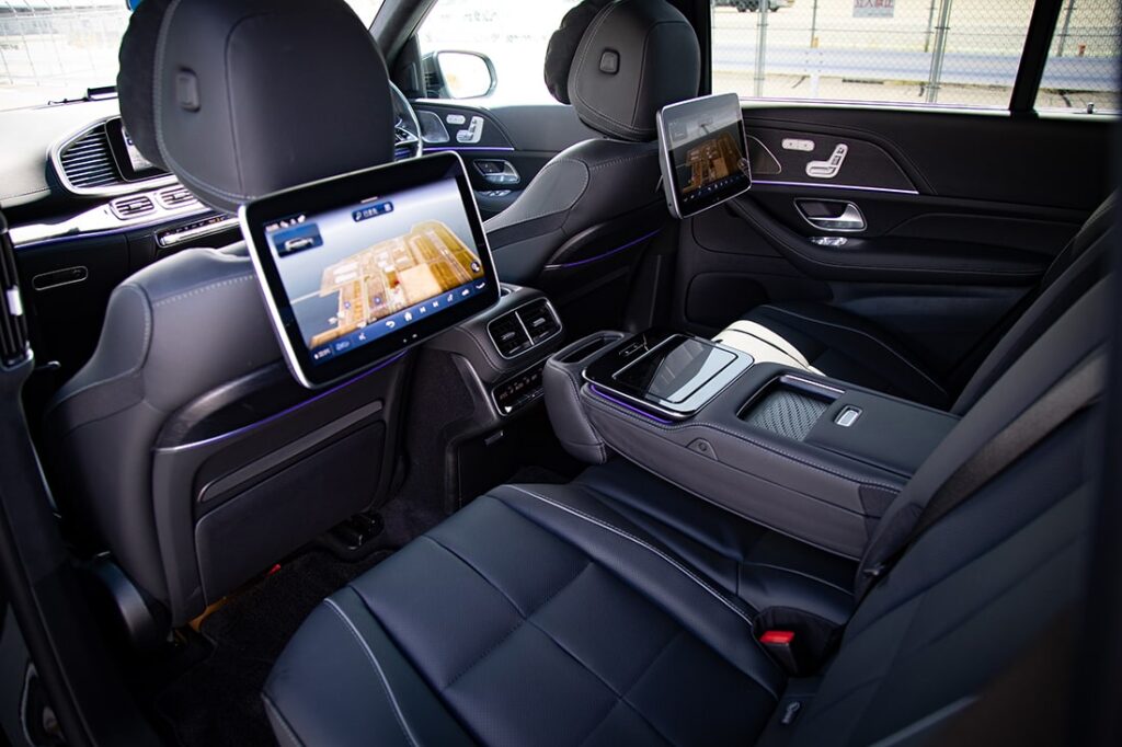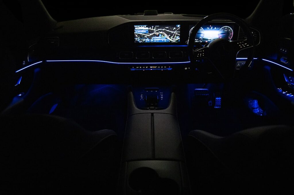 インテリアに目を向けると、そこはまさに移動する“ラグジュアリーラウンジ”ともいうべき世界が広がる。空間を覆い尽くすのは贅を極めた素材とモダンな造形。ナッパレザーのシート、ウッドとアルミニウムのコンビネーションによるトリム、そしてアンビエントライトが織りなす空間が非日常の寛ぎを演出する。3列7人乗りの室内は広々として、大人もゆったり乗車できるのが嬉しい。しかも、3列全席に独立調整できる空調設備とシートヒータが標準装備されていて、乗員全てがVIP感覚で移動できる仕様となっている。