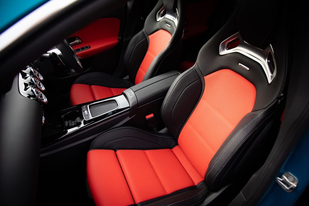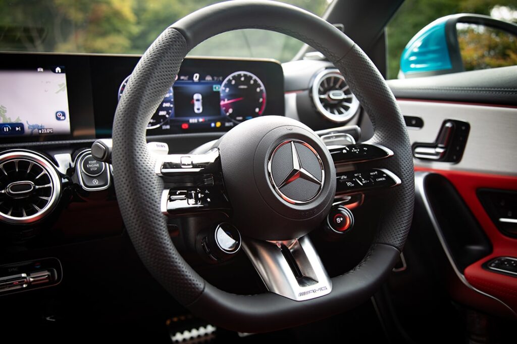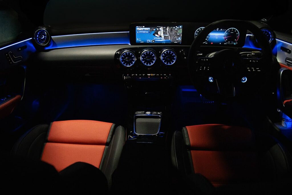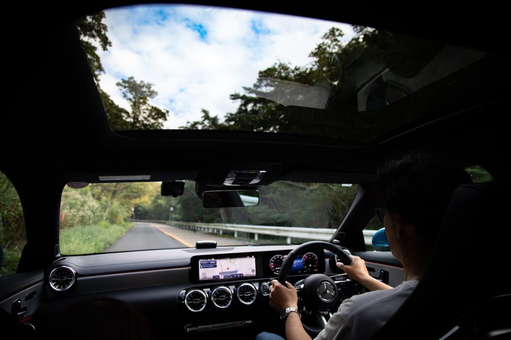 室内空間も、AMG仕様でよりスポーティに統一されている。レッド/ブラックのコンビカラーが気分を上げてくれるAMGパフォーマンスシート(オプション設定)はヘッドレスト一体型のレーシーなデザイン。今回のようなワインディングロード走行時にもしっかり体をホールドしてくれるのが嬉しい。フラットボトムのデザインやAMGドライブコントロールスイッチがモータースポーツの世界を彷彿とさせてくれるAMGパフォーマンスステアリングも超クール!! MBUXインフォテインメントシステムによる直感的な操作性、アンビエントライトが彩るインテリア、アルミニウムの硬質な質感が映えるスタイリッシュな室内デザインは、どれも乗る者すべてに深い満足感をもたらしてくれる。コンパクトクラスでありながら、ここまで日々をスタイリッシュに彩ってくれるモデルは他にないだろう。